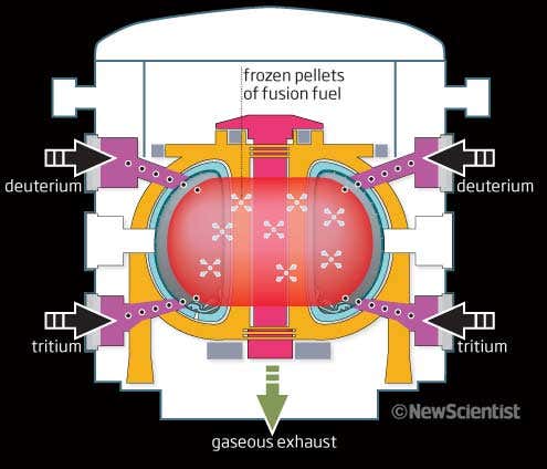 Unburnt fuel is also recovered from the gaseous exhaust and the reaction is fine-tuned by firing frozen pellets of fusion fuel deep into the plasma.