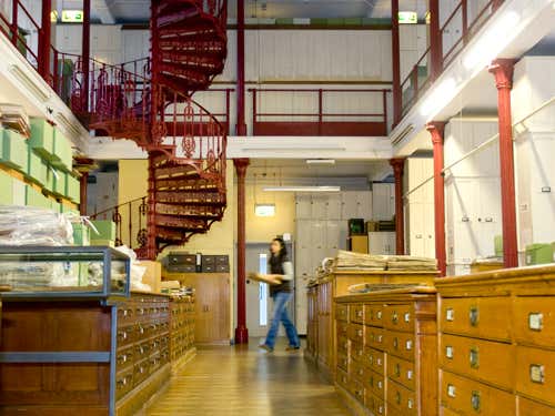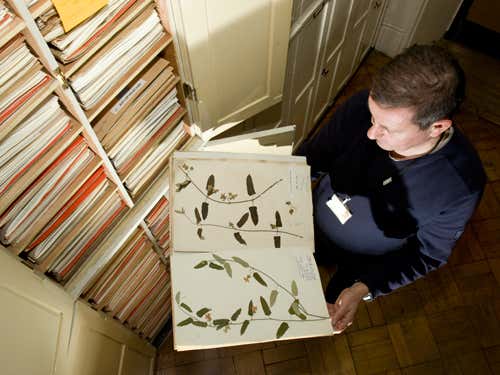 The herbarium, housed in an 18th-century building, holds over 7 million preserved plant records dating back as far as 150 years. A specimen is dried, pressed and archived with data about its origin, collector, number and identity. The species name is added once fully identified.