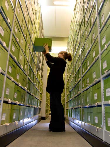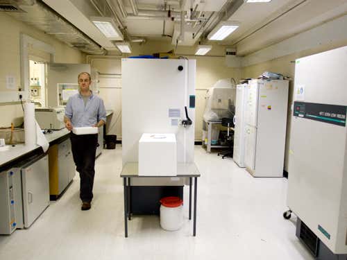 A worker collects samples from the DNA store in the Jodrell laboratory. The DNA bank currently contains over 36,000 samples of plant genomic DNA, all stored at -80 °C. They are stored with information on the plant’s names, collectors, localities and so on. Kew aims to extract DNA from all the plant species grown at the gardens as well as samples collected from expeditions around the world.