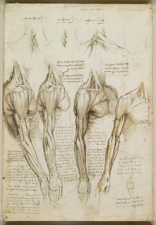 Da Vinci’s interest in anatomy was both scientific and artistic, as shown by his note on his pages on arm and neck muscles: