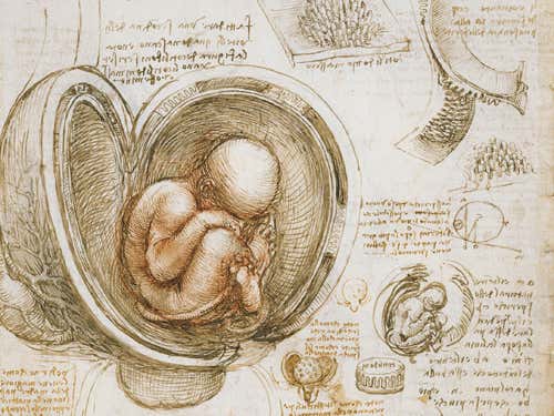 As an artist, da Vinci often returned to the theme of a mother and child. Here, in an uncharacteristic use of colour in his anatomical sketches, he looks at the physical relationship between a mother and her unborn child: