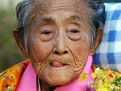 This woman is celebrating her 97th birthday at a nursing home near Ogimi village, Okinawa, Japan.