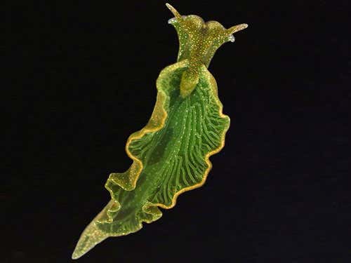 This leaf-like sea slug steals chloroplasts – a plant cell’s photosynthetic machinery – from the algae it feeds on. The chloroplasts are stored in gut cells, and branches of the gut extend through E. chlorotica‘s body, giving it a large surface area for capturing light.