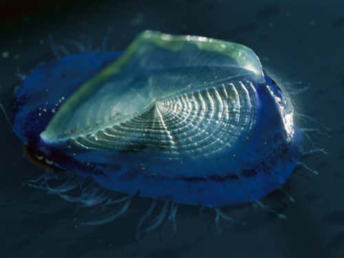 A relative of jellyfish, the by-the-wind sailor Velella velella floats at the surface of the sea with its tentacles dangling down to catch prey. Each one is a colony, some parts of which contain algal symbionts belonging to the genus Scrippsiella.