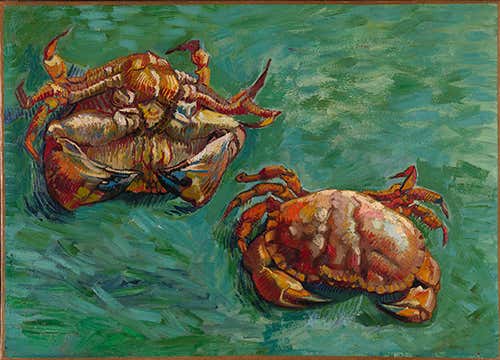 Bending his spectrum of rainbow colours into a circle, Newton created the colour wheel, which inspired the idea of “complementary colours” – those located opposite one another produced striking contrasts when juxtaposed. This notion found favour with the impressionists and their successors: the red crabs in this work, painted by van Gogh just after his release from hospital in Arles early in 1889, stand out strongly from the green backcloth.