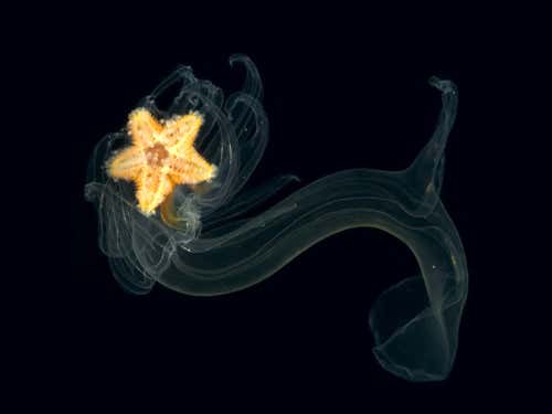 This semi-transparent gossamer larva floats in the ocean, feeding on algae. It can grow to an extraordinary 4 centimetres long before it begins its remarkable transformation. Instead of merely shedding its skin to become an adult, a cluster of cells lining the larva’s insides grows, like an alien invader, until eventually this interloper migrates to the outside and swims away as the adult creature, leaving the larva to live on for several months. But what does this sprite become?