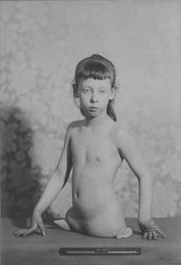 This image, from a collection at Philadelphia’s Mutter Museum, shows a young girl with amelia, a condition marked by undeveloped limbs.