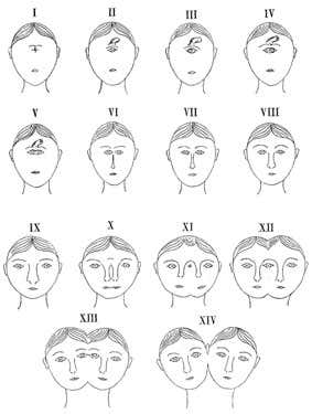 The figures beyond diprosopia, labeled XII through XIV, illustrate a condition called dicephalus, which turned out not to be an extension of diprosopia, but rather a variant of conjoined twinning