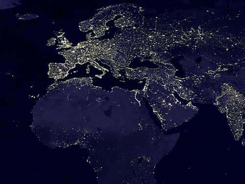 This image clearly shows that the cities of major Europe are along the coasts but there are roads, lighting and population centres across the entire region.
