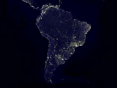 This image shows the densely populated areas on the coasts of South America, and in northern Colombia and Venezuela.