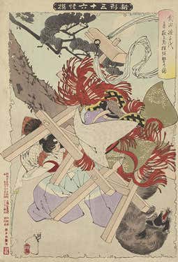 This wood engraving by Taiso Yoshitoshi (1839–1892) shows the ruler Takeda Shingen as a young boy, fighting a raccoon by moonlight.