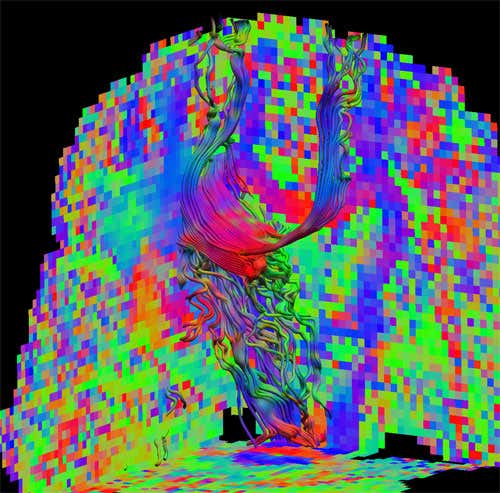 Images like this could map where a person’s cortico-spinal tract lies – so it could be avoided during surgery – and to measure how intact it is, in someone with Alzheimer’s or multiple sclerosis.