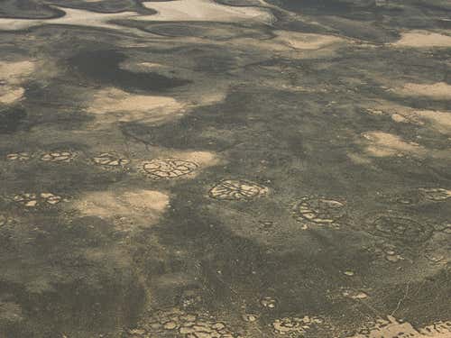 Wheels found in the Arabia peninsula are between 20 and 70 metres in diameter. They are usually found in isolation, but sometimes occur in groups. The 13 wheels in this photograph were discovered around the Azraq oasis in Jordan.