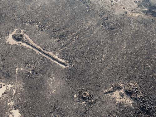 A “kite” with a 250-metre-wide head and tails that are each around 500 metres long has been overlaid here by a hooked and squiggly wall. While the kite – a common structure in these parts – is thought to have served as an animal trap, the purpose of the walls is unknown. “They can best be described as a sort of landscape art,” says Kennedy.