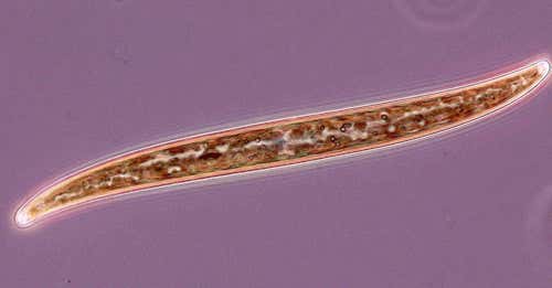 This slender microbe is a pennate, or feather-shaped, diatom. The brown photosynthetic elements are enclosed in a silicate “glasshouse”. Made of two mirror-image halves, pennate diatoms developed after their cylindrical cousins.
