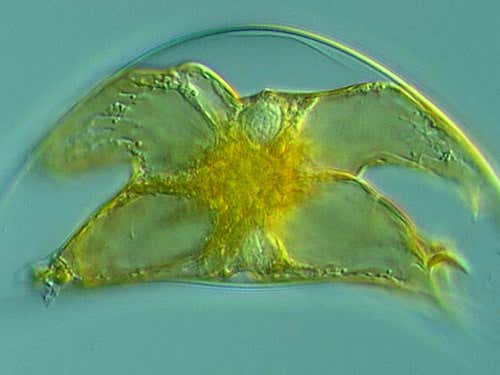 The chloroplasts of this bioluminescent dinoflagellate follow the sun across the cell. This individual is dividing – the separated nuclei are visible above and below the central knot of photosynthetic material