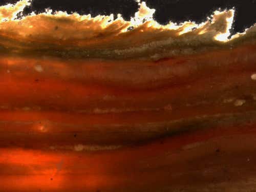 This particular mat cross-section comes from Baja California, a high-salinity area. The different groups of microbes are evident in the layers.