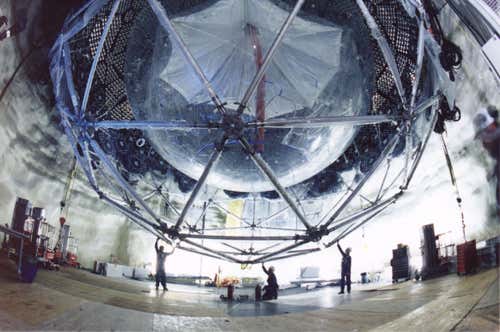 The Sudbury Neutrino Observatory is located over 2 kilometres underground in a nickel mine in Ontario, Canada. Like Super-Kamiokande, its deep underground location shields it from cosmic rays. Before being turned off in 2006, the SNO vessel was filled with 1000 tonnes of heavy water, and spotted neutrinos in a similar way to Super-Kamiokande. SNO specialised in spotting neutrinos coming from the sun. Plans are under way to upgrade the experiment.