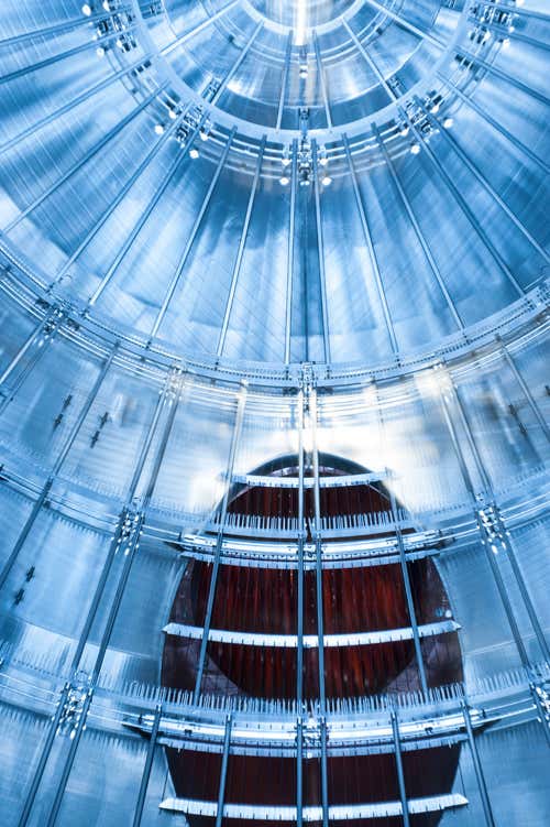 Neutrinos interact so rarely with matter that vast experiments are needed to spot them. Central to the Super-Kamiokande experiment in Japan is a huge stainless steel tank, 39 metres in diameter. It is filled with 50,000 tonnes of purified water. On the rare occasion that a neutrino interacts with the water, it converts to a charged particle that then produces a flash of light. More than 13,000 sensitive light detectors surrounding the tank watch for these flashes. They can pinpoint whether the neutrinos originated from the Earth’s interior or from the heavens above.