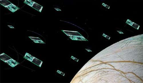 Lots of tiny space probes could speed up exploration by allowing a single mission to conduct a wide survey while also gathering data from specific locations. A small satellite in orbit would map the surface from afar and then deploy these circuit-board probes to examine the surface in locations of particular interest.