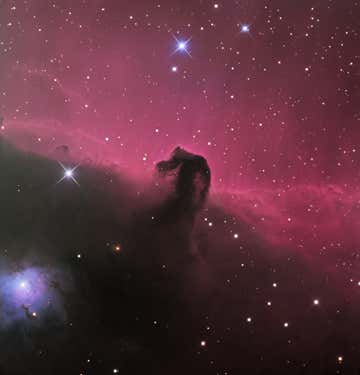 The blue patch at the bottom left are new stars which have already formed inside part of the dust cloud, and the red glow behind the horse head itself is ionised hydrogen gas.