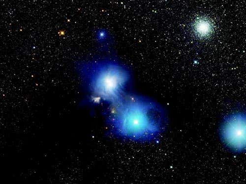 This photograph shows two dust clouds reflecting the light from nearby stars.