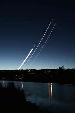 Taken with an exposure time of two hours, this photograph shows the trail of the three celestial bodies rising in the sky at sunset.