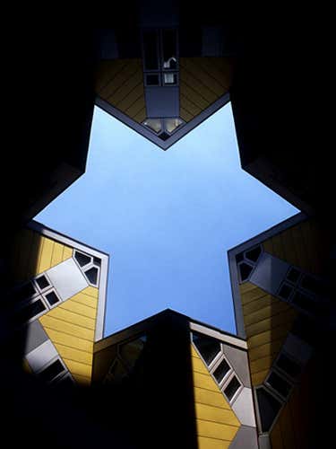 This image takes a skyward-looking view of the www.galinsky.com/buildings/cubichouses/ “>Cube Houses in Rotterdam. The Cube Houses were designed by Piet Blom as an offset cube design on a central column with three sides of the cube facing the ground & three sides facing the sky.
