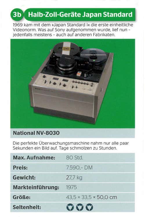 The “Japan standard”, introduced in 1969, meant that half-inch tapes recorded on one manufacturer’s equipment could at last be played back on another company’s machines (most of the time, anyway). The Japan standard NV-8030 was part of an early CCTV system that, when set to take a picture every couple of seconds, could record for 80 hours non-stop.