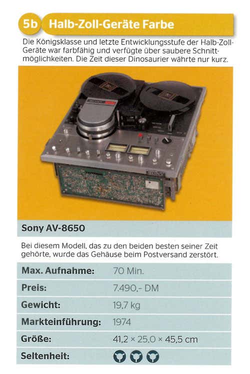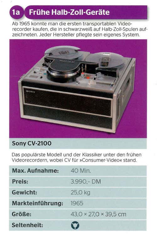 The CV-2100 was the most popular early portable video recorder, and like other systems of the time, it recorded in black and white on half-inch tape. “Portable” it may have been, but as it measures 43 × 39.5 × 27 centimetres and weighs in at 25 kilograms, you’d be lucky to get it on a plane as carry-on luggage these days. Then again, if you could afford to shell out 3990 Deutschmarks for it – equivalent to about $10,000 today – you could probably afford another seat for it.