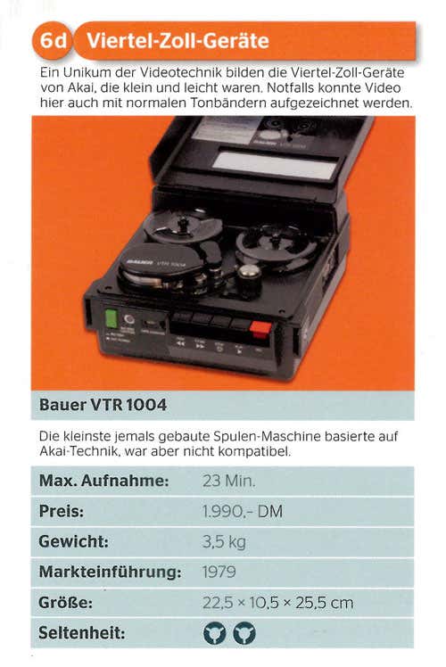 The quarter-inch video recorders made by the Japanese firm Akai were relatively small and light, and could record on audio tape at a pinch. This 3.5-kilo Bauer machine, with a maximum recording time of 23 minutes, was based on Akai technology.