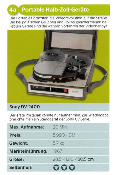 The days of the half-inch dinosaurs were numbered as soon as Sony brought out the first “portapak” in 1967. The DV-2400 could record only 20 minutes of footage and needed a separate machine for playback, but at 5.7 kilograms, it was the first truly portable video recorder: you carried the recorder on shoulder strap with the camera connected by a cable. The forerunner of today’s video mobiles, portapaks became popular with police and political groups alike for recording the student demonstrations that flared across Europe in 1968.