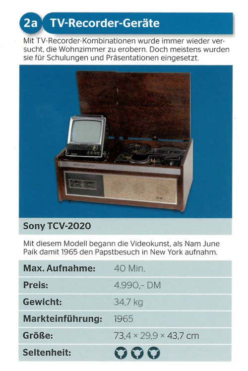 Despite hopes that they would conquer the living room, early combined TV and video recorder units were mainly used in schools and for business presentations. The Korean-American artist Nam June Paik used the TCV-2020 to make the first piece of video art, a now lost recording of Pope Paul VI’s 1965 visit to New York. The unit tipped the scales at almost 35 kilograms – a lot to lug around, especially given that its maximum recording time was just 40 minutes.
