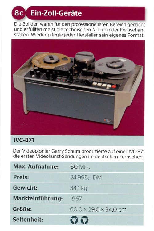 One-inch video devices were mainly intended for TV professionals, and every firm had its own technical specifications. The artist Gerry Schum used this 34-kilo IVC recorder costing almost 25,000 Deutschmarks – around $60,000 in today’s money – to make the first video art shown on German television. This included TV As a Fireplace, a 3-minute colour recording of a burning hearth that the WDR station used to close its daily programming in the run-up to Christmas 1969.