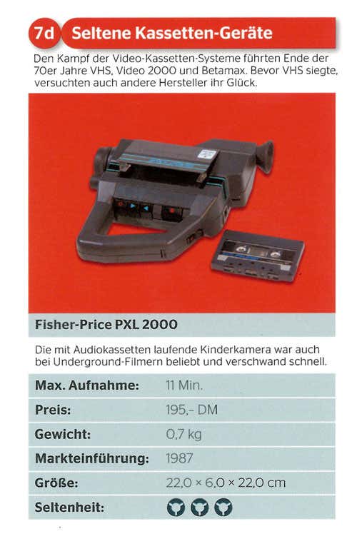 As VHS, Betamax and Video 2000 waged the great war of the video formats from the late 1970s on, other manufacturers tried their luck. This kids’ camera from the firm Fisher-Price recorded on ordinary audio cassettes, albeit for only 11 minutes. Its cheapness, 700-gram weight and small size made it popular with underground film-makers.