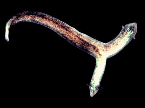 The freshwater planarian Dugesia, pictured here, has been experimentally split with a scalpel from the head to the pharynx, resulting in a two-headed animal.