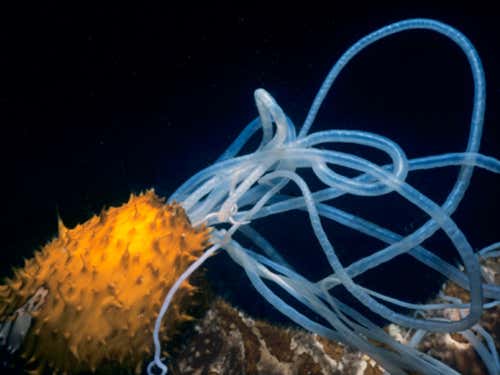 This sea cucumber (Bohadschia argus) – pictured in the Celebes Sea off Sulawesi, Indonesia – has a dramatic response to predators. It eviscerates itself, shooting its internal organs out of its rear end.