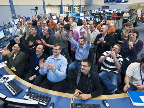 In this picture, CERN scientists celebrate the moment that beam 1 was ramped up to the record-breaking energy of 1.08 teraelectronvolts for the first time.