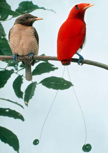 The vibrant red plumage of the male king bird of paradise (Cicinnurus regius) make a dramatic contrast with the restrained tones of the female. The green disc at the end of each tail feather has earned it the nickname of the dollar bird. The males certainly put their bright colours and ornamental feathers to good use: their elaborate dances, poses, song and other rituals can last for hours. And, as many males are polygamous, such displays can end up taking a significant amount of their lives.