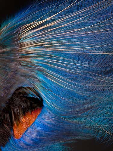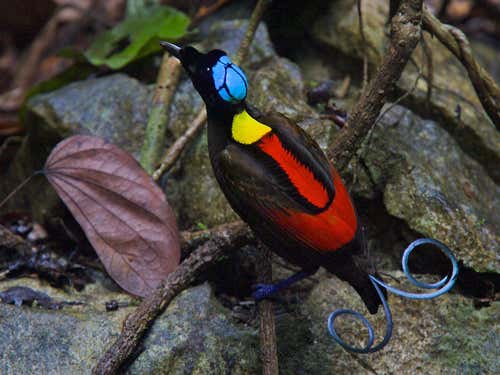 The bare-skinned head of the male Wilson’s bird of paradise (Cicinnurus respublica) is bright turquoise with a fine black pattern on it and an iridescent sheen. The brightness of his head and curled tail feathers allow the females to distinguish the mature birds from the younger ones.