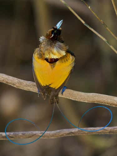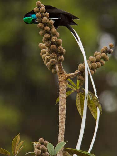 The male King of Saxony bird of paradise (Pteridophora alberti) guards his territory from an elevated perch. To display his prowess, he jumps up and down on the spot, showing off two magnificent quills notched with blue enamel-like plates. As he jumps and calls out, the quivering plumes attract the females.