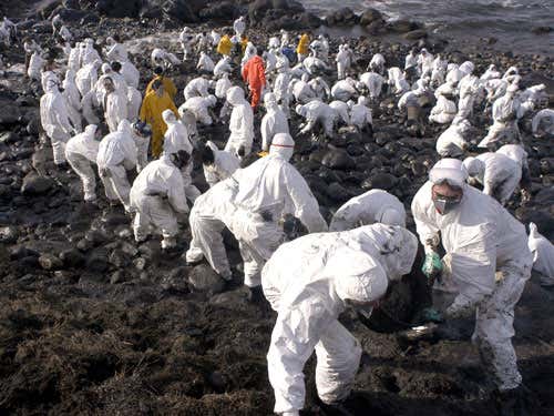 On 13 November 2002, a storage tank on the oil tanker Prestige ruptured during a storm off the north-west coast of Spain. French, Portuguese and Spanish authorities refused the ship permission to dock, and six days later it broke in two, releasing 76,000 cubic metres of oil. Roughly €100 million was spent extracting oil from the sunken hull using remotely operated submarines, but this was dwarfed by the shore clean-up: removing oil from the Spanish coast alone cost €2.5 billion.