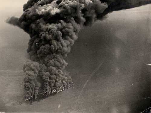 On 18 March 1967, the oil tanker Torrey Canyon struck rocks off the south-west coast of England. Attempts to refloat her failed; one member of the salvage team was killed. As the wreck started to break up, the UK government decided that burning the oil still on board was less bad than letting it enter the ocean. It took repeated attacks by navy and air force bombers to set the vessel alight, and even so the Torrey Canyon released about 145,000 cubic metres of oil – one of the world’s worst spills ever.