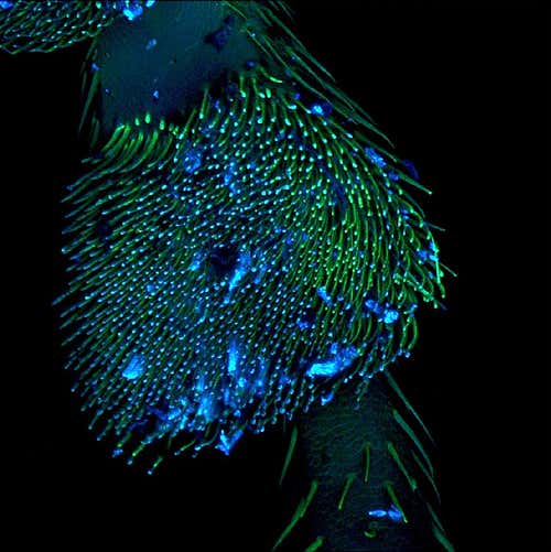 It’s hard to believe, but this bushy, glowing object is a section of a ladybug leg. Ladybugs, also known as ladybirds, are readily available to either clear your gardens of aphids or make your wine taste really funny. It was photographed by Andrea Genre of the University of Turin, Italy.