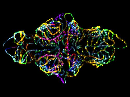 This iridescent tangle is the blood-brain barrier, which separates blood and brain fluid, in a live zebrafish embryo. Zebrafish can be seen in a household aquarium near you and only grow to about 6 centimetres long, but have similar brain chemistry to humans. It won Jennifer Peters and Michael Taylor of St Jude Children’s Research Hospital in Memphis, Tennessee, the first prize.