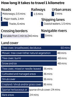 The model combines information on terrain and access to road, rail and river networks. It also considers how factors like altitude, steepness of terrain and hold-ups like border crossings slow travel.