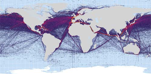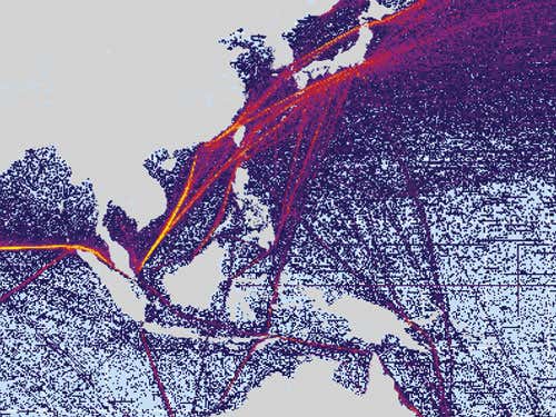 With the brightest colours representing the busiest shipping lanes, the English Channel, Mediterranean and South China Sea stand out as major trade routes.