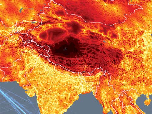 Based on satellite data from the US Geological Survey’s National Imagery and Mapping Agency, this map shows how the world is riddled with roads.