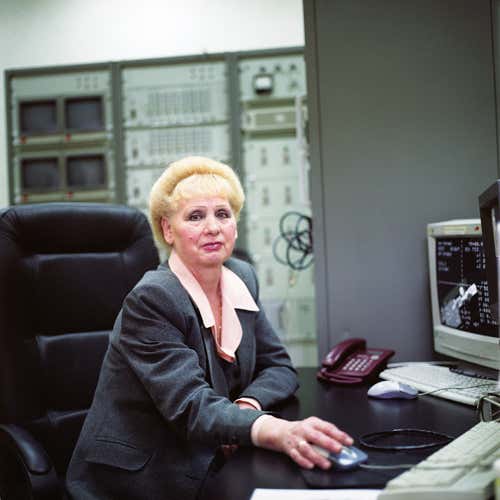 Engineer A. Osipova is at the control panel for one of Star City’s simulators, which are used to prepare crew for their experiences in a Soyuz-TMA craft.