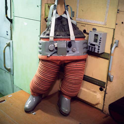 These fetching dungarees are part of a negative pressure suit. On Earth, gravity causes a pressure gradient between your feet and your head, but out in space your blood pressure equalises to 100 millimetres of mercury throughout your body. To compensate for this strange state of affairs, the body reduces the amount of blood in your system. These trousers are used to reduce these effects by stabilising blood flow in zero gravity.